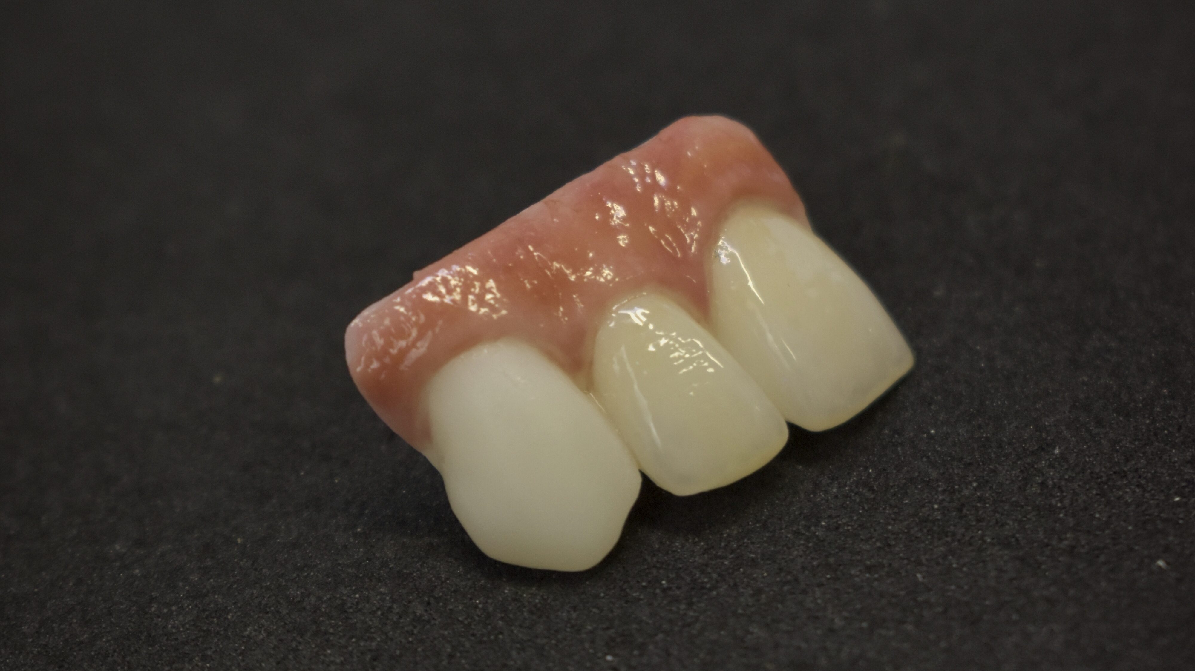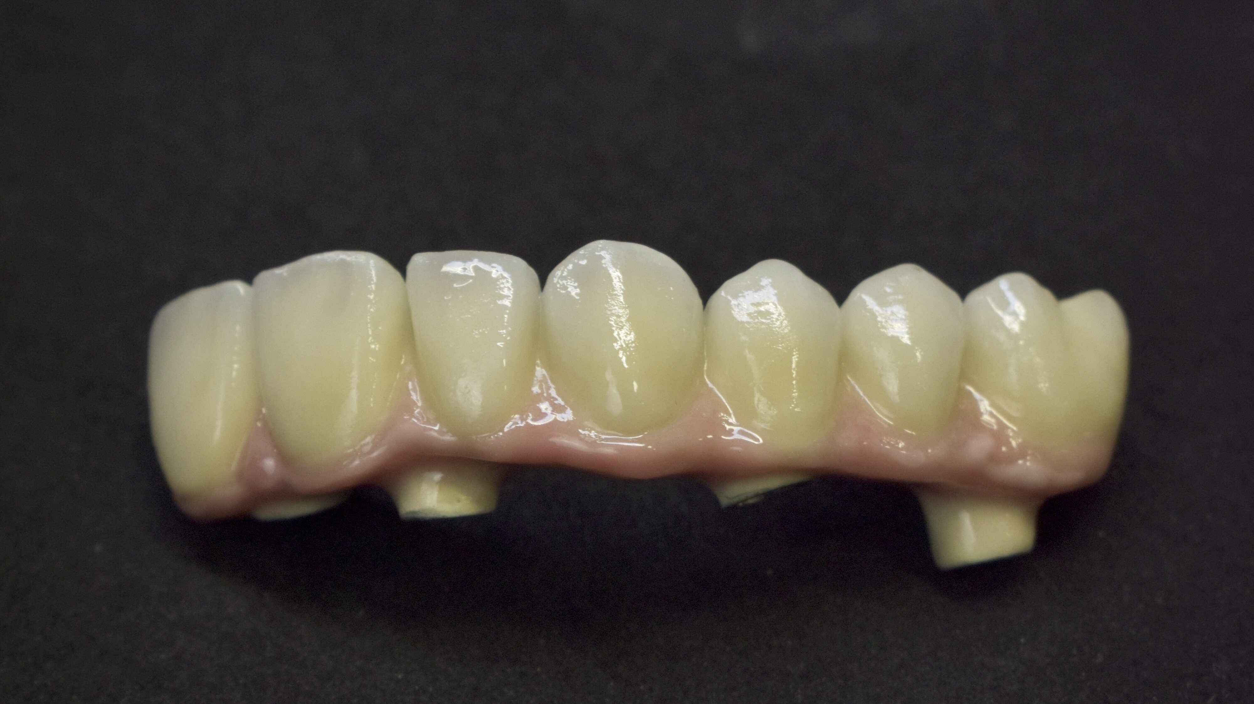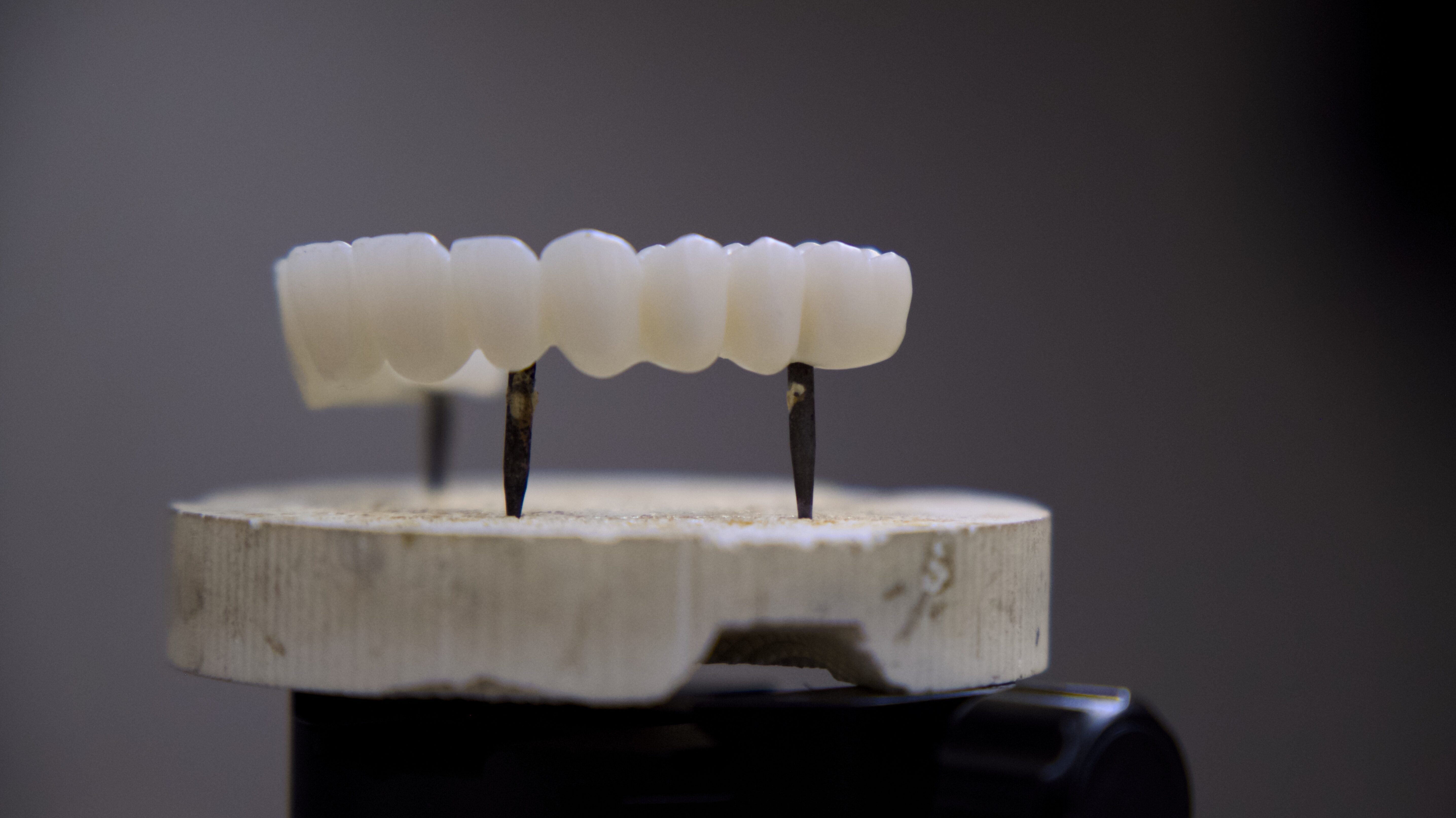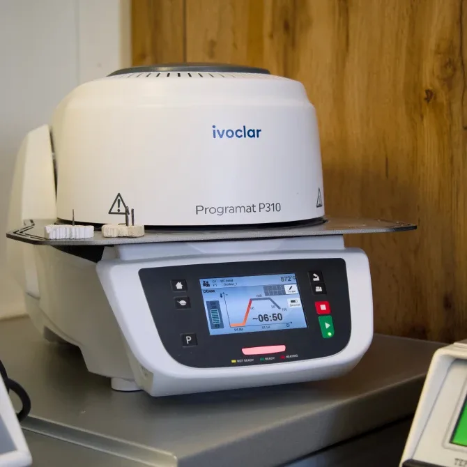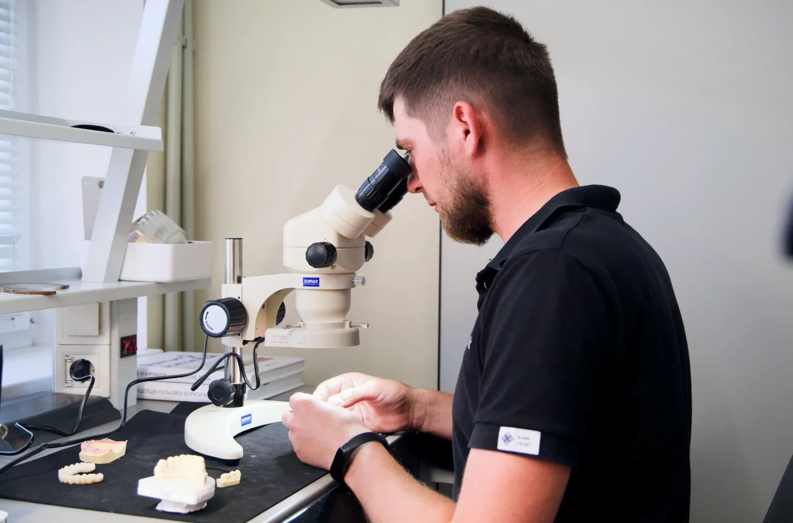 Потім проєкт втілюється у матеріалі за допомогою високоточного обладнання. Кожен протез проходить етапи індивідуального доопрацювання: нанесення кераміки, відтінків і текстури, які повторюють природну емаль. Завершальний етап включає делікатне полірування та перевірку під мікроскопом, щоб готовий виріб повністю відповідав технічним вимогам і стандартам якості.